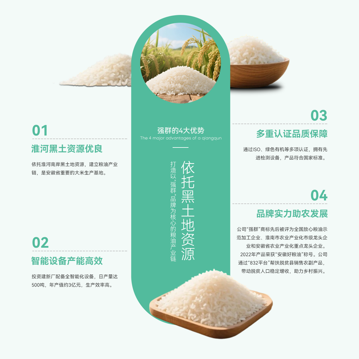 - 壽縣強群糧油貿易有限公司成立于2011年,座落在淮南市壽縣澗溝鎮,是一家集種植、加工、收儲、銷售于一體、以生產中、高檔質優、特色類大米為主的綜合性企業。公司依托準河南岸的黑土地資源,打造以“強群”品牌為核心的糧油產業鏈,是安徽省重要的大米生產基地。 為響應市場增長需求,公司2021年啟動二期擴產工程,其中新生產廠區建設投入資金近億元,建設現代化新生產線,總占地面積約4000...